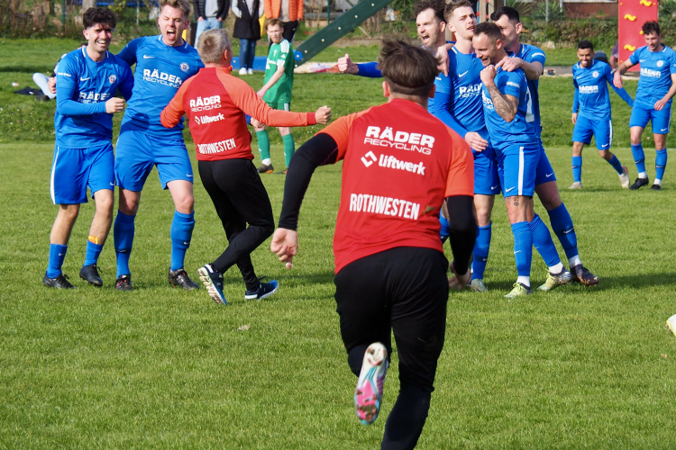 „Darf´s noch ein bisschen mehr sein?“ so titelte die HNA in ihrer Samstag Ausgabe. Ja es durfte etwas mehr sein – denn die Jungs von Übungsleiter Alfred Igel waren und sind ehrgeizig. Auf den Punkt topfit boten sie dem Tabellenführer in jeder Hinsicht Paroli. In der Abwehr stabil und in der Offensive auf den richtigen Zeitpunkt wartend neutralisierten sich beide Teams im ersten Abschnitt weitgehend. Größte Chance bis dahin (35.) durch Igor Losic der halbrechts in den gegnerischen Strafraum eindringt aber mit seinem Flachschuss am Gästekeeper scheitert. Torlos ging es in die Halbzeitpause. Nach Wiederbeginn Glück für unser Team dass die Gäste eine Riesenchance vor dem Tor vertändelten. Knackpunkt für den Tabellenführer die gelb/rote Karte für SV Spieler Schaetzke (51.). Der TSV erhöhte den Druck und kam durch Igor Losic aus kurzer Distanz mit Wucht, im zweiten Anlauf, zur verdienten 1:0 Führung. Erneut „Igi“ und Isilak hätten den Sack zu machen können, scheiterten aber. Weitere Chancen von Toni und Igor blieben ungenutzt. In der Schlussphase überschlugen sich die Ereignisse und die Emotionen kochten hoch. Den Gästen gelang gegen unkonzentrierte Platzherren in Unterzahl aus heiterem Himmel der Ausgleich (87.). Doch der Tabellenführer hatte die Rechnung ohne die Platzherren gemacht. Im Gegenzug war Igor Losic auf der linken Seite durchgebrochen und knallte die Pille an den rechten Innenpfosten. Von dort trudelte das Sportgerät auf der Linie entlang und erstickte den Torschrei der Rothwester Fans. In der Nachspielzeit war es dann aber soweit. Wieder tankte sich „Igi“ auf der linken Außenbahn durch und flankte scharf vors Tor. Mischa Serdiuk spritzte in die Hereingabe und traf zum 2:1. Der Rest ging im Jubel der Rothwester Zuschauer unter.